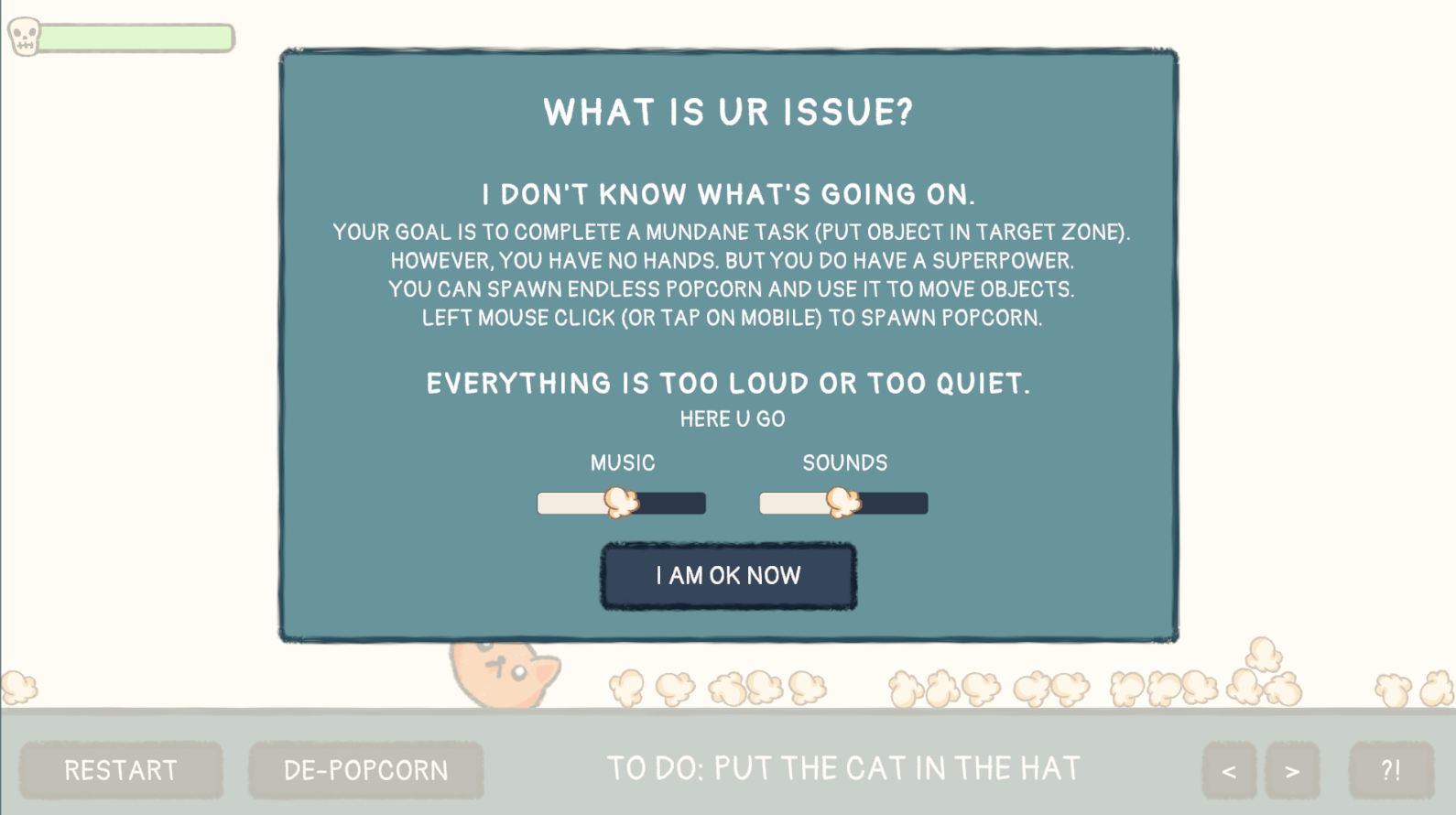 very basic, repetitive gameplay, but who cares? this game put a smile on my face! the physics are… they’re something! they sure do physic! the artstyle is charming, and the way the menus are worded and designed has a very “shoved together and thrown at you” feel that i also find very charming, and fitting for a jam with a three-hour time limit. even though you exceeded the time limit, you have an honorable mention in my heart. even though i have never heard of this gamejam before.